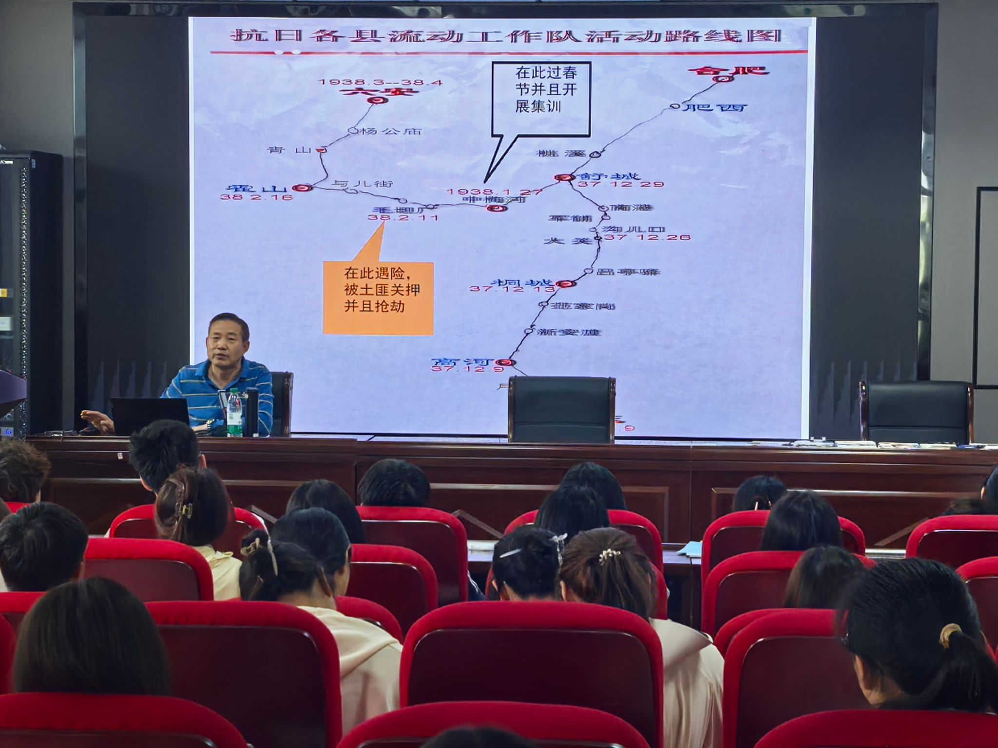 课上,吴毅安以习近平总书记关于讲好红色故事的重要指示为切入点,围绕安徽青年员工抗日救亡工作团的历史,从时代背景、安徽青年员工抗日救亡工作团的组建历程、深入皖西山区开展民众动员的实践过程,以及抗日救亡工作团的历史意义与抗战精神的时代价值等多个维度进行讲解。他通过展示详实的史料和生动的案例,系统呈现了工作团的英勇事迹,深刻阐释了中国共产党人民战争理念的战略意义,让同学们清晰认识到抗战精神在新时代的传承价值与实践要求。