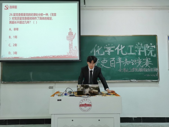 “1935年12月9日,在中国共产党领导下,在哪里首先爆发了大规模的员工抗日救亡爱国运动,这次运动史称一二九运动”,题目宣读完毕,“开始抢答”主持人发出抢答口令,选手们迅速作出反应,各班的抢答选手通过抢纸巾的方式获得优先答题权,比赛进入白热化阶段,各班参赛队伍积极踊跃,赛场气氛高涨,各队伍争锋相对,比分你追我赶。本次党史知识竞赛分为2019级、2020级两组对抗赛,共有16个班级参加,每班四名参赛队员,各派一位代表上台抢答,其余三名队员助力作答。2019级和2020级分别各自进行了三场小组赛和一场决赛,最终由2019级化学专业(3)班、2020级化学专业(3)班获得一等奖。