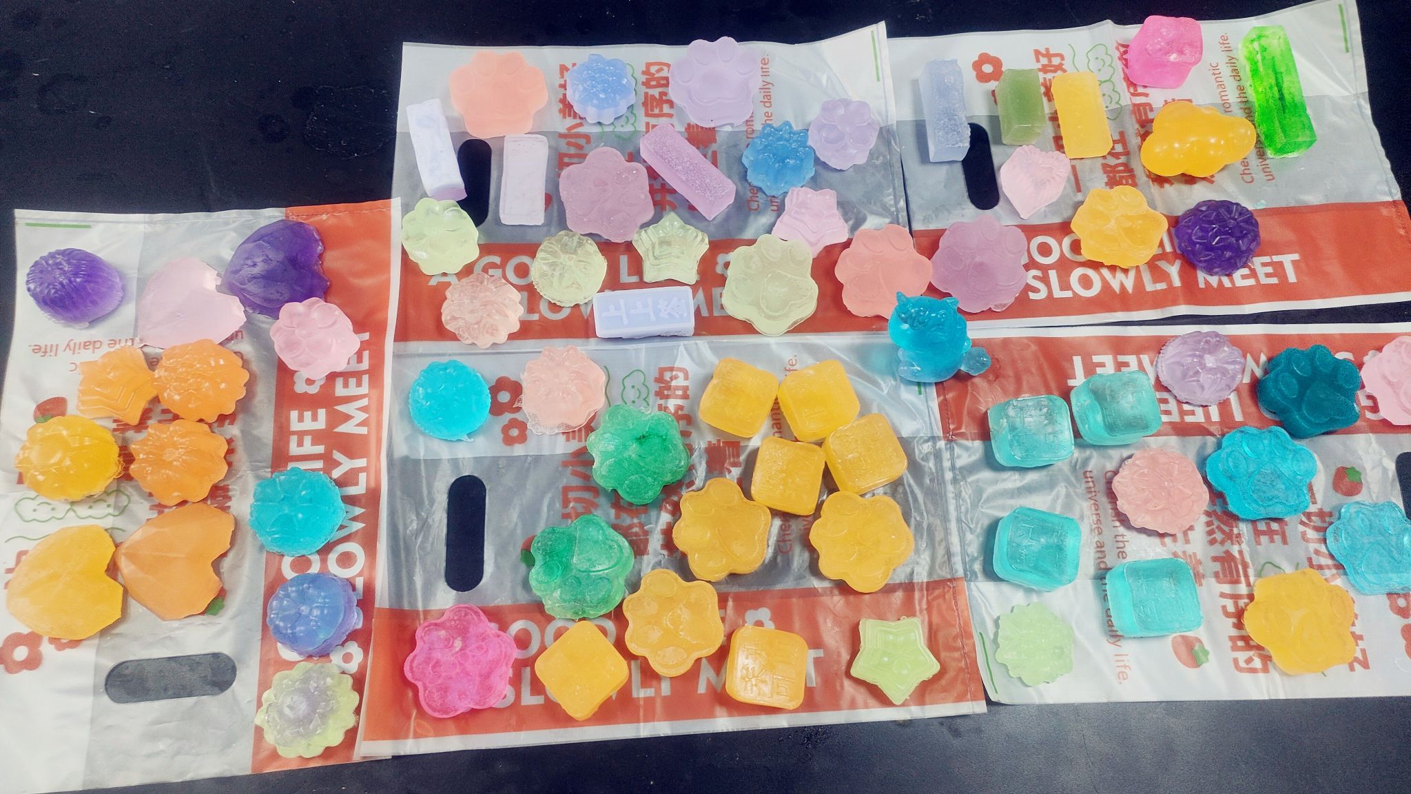 切皂基、熔化搅拌、加入自己喜欢的香精油、将皂基倒入模具脱模,根据自己的喜好刻画上了不同的图案,一份独一无二的手工香皂便完成了。手工香皂的制作不仅仅激发了同学们学习化学的兴趣,提高他们动手制作的能力,更让同学们在亲自动手的过程中收获满满的成就感。来自法语专业2022级(1)班的杨紫彤说:“第一次来到化学实验室,一直以来以为制作这种东西很复杂,今天亲手尝试后感觉自己以后也可以动手制作,真切地让我感受到了化学的魅力,也让我在全身心的制作过程中,缓解了学习压力和生活的烦恼。”