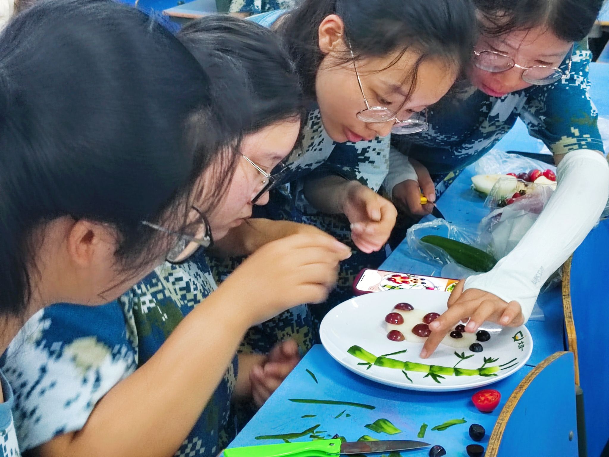 橘子苹果拼成的“猴子捞月”,西瓜蓝莓拼成的“繁荣昌盛”,葡萄橙子拼成的“水果树”……同学们尽情发挥创意,巧用各类水果为原材料,通过切片、挖空、雕琢、摆盘进行裁剪和拼接,将普通的水果变成了一件件精美的工艺品。其中,作品《月上枝头桂香醉》凭借独具特色的造型和精致的摆盘赢得评委和现场观众的认可与喜爱,橘子葡萄由里向外层层错开叠加形成花瓣形,石榴籽散落在黄瓜拼成的枝干上开出了朵朵梅花,一幅栩栩如生的水果画卷由此展开,令人回味无穷。“活动中大家一起构思创意、购买材料、动手制作、现场讲解,既是一个熟悉新同学锻炼团队合作能力的契机,更让我对老员工活充满了期待,在这里我可以尽情展示自己的奇思妙想,让创意变成现实。”2024级化学专业3班的朱雨欣表示。
