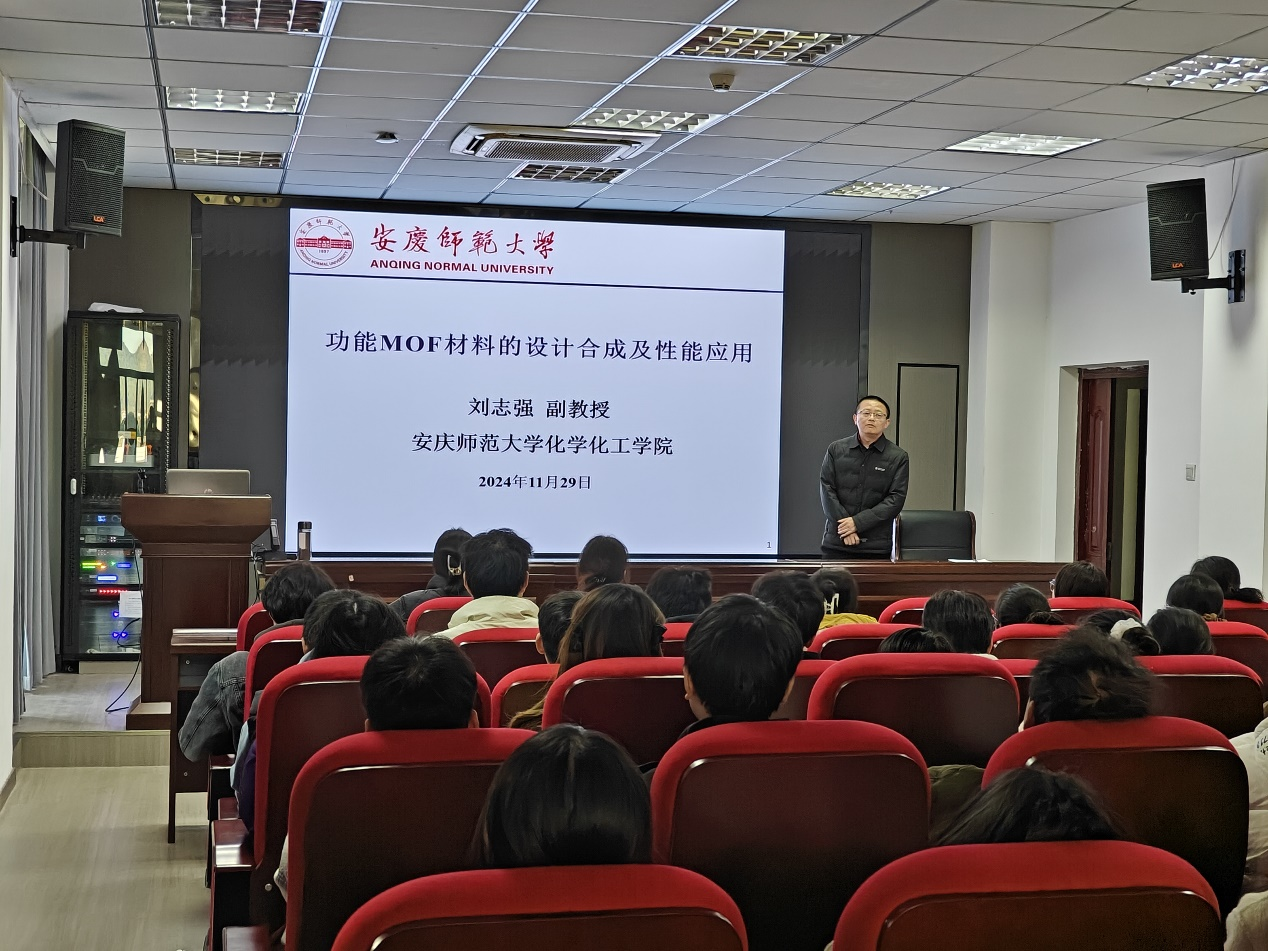 讲座中,刘志强首先介绍了MOF的概念、影响MOF材料合成的因素、功能MOF材料的应用和最新研究进展等。随后,介绍了其课题组近年来在功能MOF材料的设计合成及性能应用的研究成果,并对功能MOF材料的发展方向进行了展望。报告结束后,刘志强结合自身科研经历与指导员工经验,就员工关心的考博和学科比赛等进行了细致地指导,鼓励同学们要立足当下,不断进取,勇攀科研高峰。