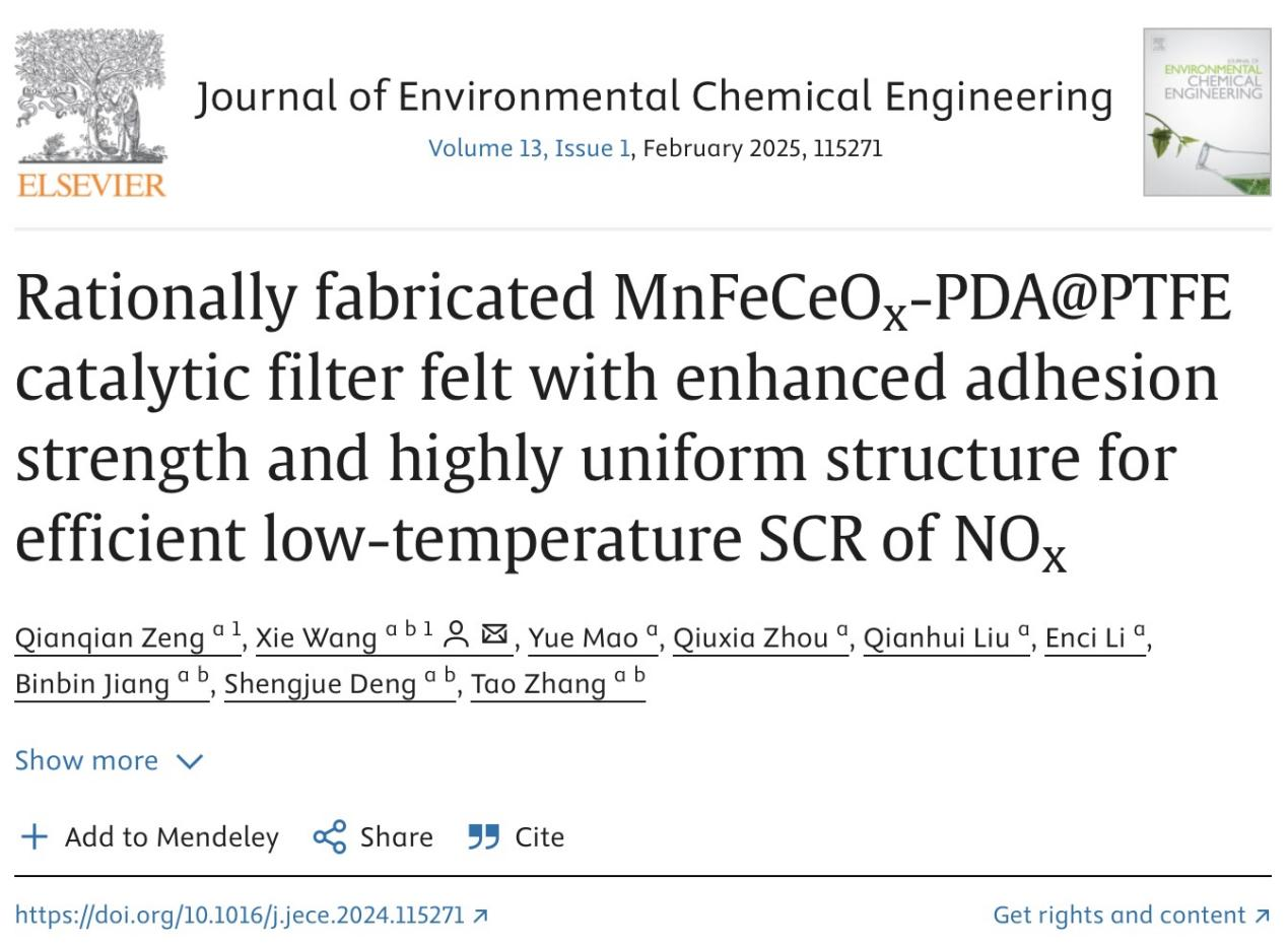 近日,william威廉英国官网化学2022级本科生曾倩倩以第一作者身份在国际知名杂志《Journal of Environmental Chemical Engineering》(中科院TOP期刊,影响因子为7.4),发表题为“Rationally fabricated MnFeCeOx-PDA@PTFE catalytic filter felt with enhanced adhesion strength and highly uniform structure for efficient low-temperature SCR of NOx”的研究性学术论文。该论文以william威廉英国官网为唯一完成单位,公司教师汪谢为论文的共同一作及通讯作者,另有材料化学及化学专业多名本科生及教师为共同作者。