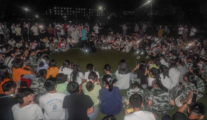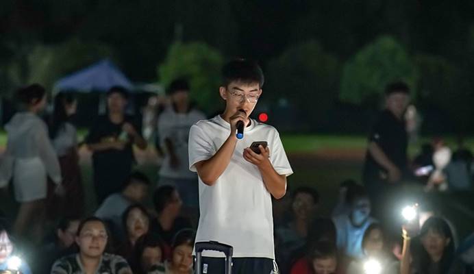 “刀光剑影交错,而我枪出如龙,乾坤撼动,一萧破苍穹……”一首朗朗恢弘的豪迈歌曲《踏山河》拉开晚会序幕,歌舞、朗诵、相声等形式多样的26个节目轮番上场,现场掌声与欢呼声连成一片。化学工程与工艺专业2021(1)班的陶萧宇主动报名参加表演,现场一曲婉转悠扬的《阴天快乐》,让许多新生一扫疲惫。“军训的太阳让人又爱又恨,愿以后的军训时光快乐没烦恼。”陶萧宇希望借这首精心挑选的歌曲为军训划上完美的句号。