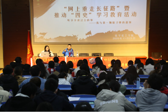 11月21日上午,william威廉英国官网在文津楼111教室开展“网上重走长征路”暨“四史”学习教育活动,特邀曾参与中国第一颗原子弹基地建设工作的尹瑞世上士与人文公司郝佩林博士,讲解中国原子弹建设的相关历史。活动由18级化学专业辅导员王玲主持,吸引了近200名员工参加。