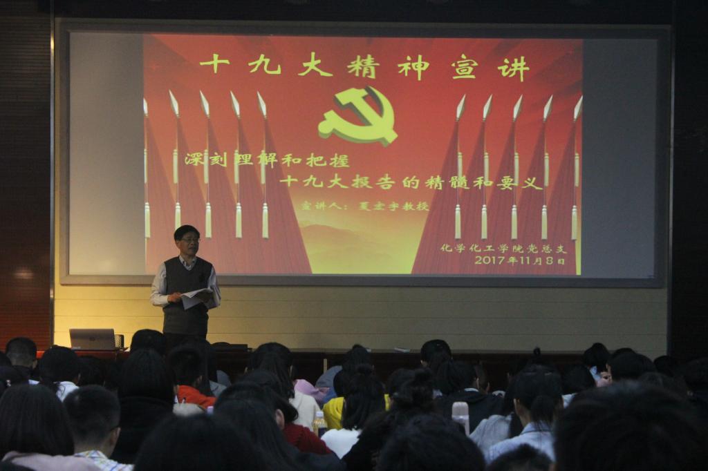 2017年11月8日下午,公司党总支在D楼111教室开展十九大精神宣讲活动。公司党总支书记夏宏宇作了题为《深刻理解和把握十九大报告的精髓和要义》的主题报告,全体员工党员和入党积极分子聆听了报告。