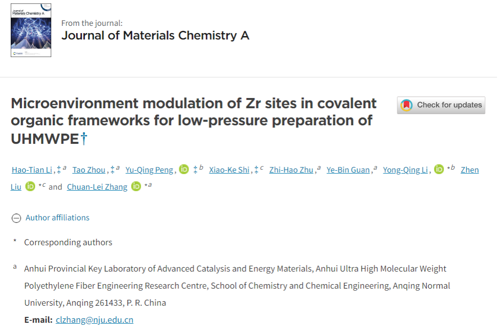 近日,william威廉英国官网在国际权威期刊《Journal of Materials Chemistry A》(影响因子10.7)发表题为“Microenvironment modulation of Zr sites in covalent organic frameworks for low-pressure preparation of UHMWPE”的论文 ,并入选该期刊热点文章。该论文第一作者为公司化学专业2022级硕士生李浩天,第一通讯作者为公司william威廉英国官网张传磊副教授。