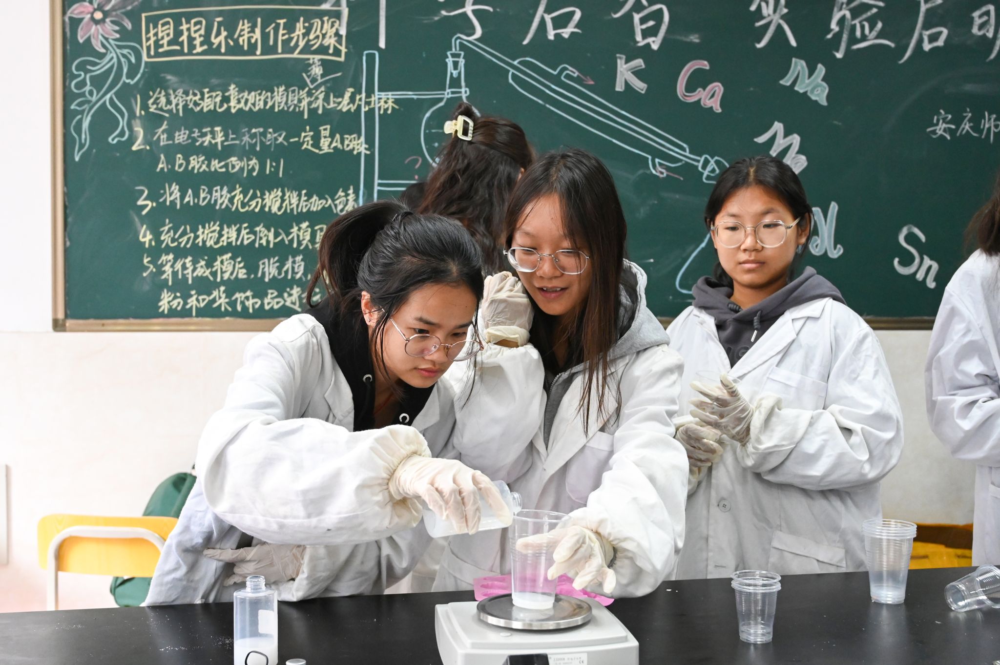 称取AB胶、加入色素、充分搅拌……实验步骤被条理清晰地罗列在黑板上。“A胶与B胶的克重必须保持一致。”活动正式开始前,化学工程与工艺专业2023(2)班的廖芸颉作为讲解员,向参加此次活动的员工们详细介绍了制作捏捏乐所需的材料及注意事项。小老师们在实验室的各个角落穿梭,随时为需要帮助的员工提供指导。“看到他们从起初的迷茫无措到掌握技巧后的自信从容,我觉得自己的付出是有意义的。”廖芸颉坦言。